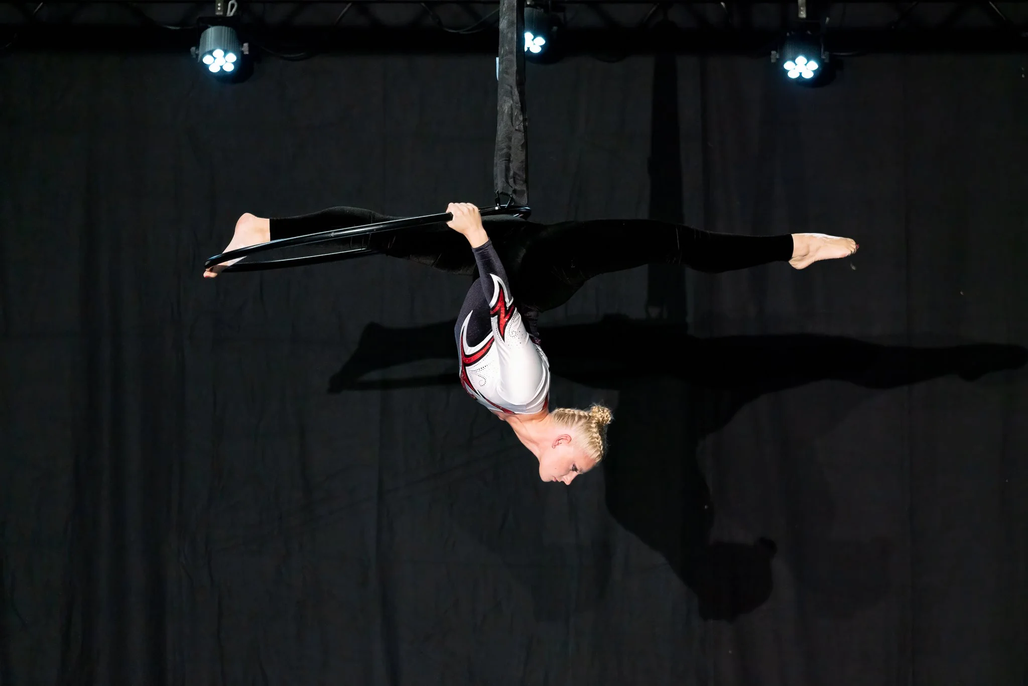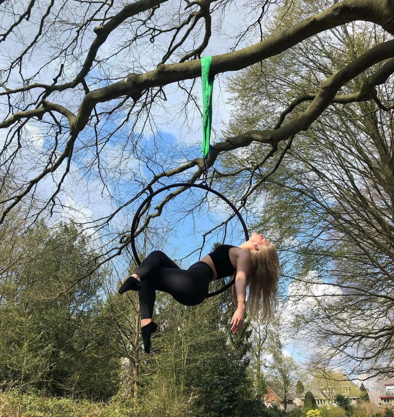 "Aerial Hoop" wordt in het Nederlands vaak aangeduid als "luchtring" of "Aerial Ring". Het betreft een vorm van luchtacrobatiek waarbij artiesten optreden aan een grote metalen ring die aan een ophangpunt bevestigd is. De artiesten voeren verschillende acrobatische bewegingen en poses uit op en rondom de ring terwijl ze in de lucht hangen. Wat de hoepel onderscheidt, is dat deze doorgaans op hoogte hangt en niet per se extreem hoog hoeft te zijn. Dit is handig wanneer je een act wilt uitvoeren, maar de beschikbare hoogte op je locatie beperkt is.
